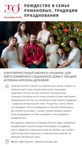 10 декабря 2025 года в 11.00 в кафе “Пушкин” на Тверском бульваре в рамках Международного дня благотворительности “Щедрый вторник” состоится благотворительный завтрак с авторской лекцией о рождественских традициях дома Романовых.