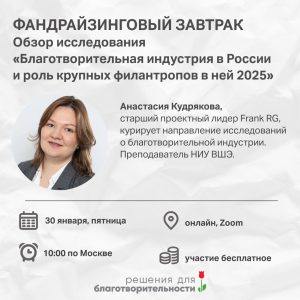 30-го января АНО «Решения для благотворительности» (ранее – Charity Solutions Consulting) приглашают на очередной виртуальный фандрайзинговый завтрак, его тема – обзор исследования «Благотворительная индустрия в России и роль крупных филантропов в ней 2025», проведённого командой Frank RG совместно со Sber Private Banking.