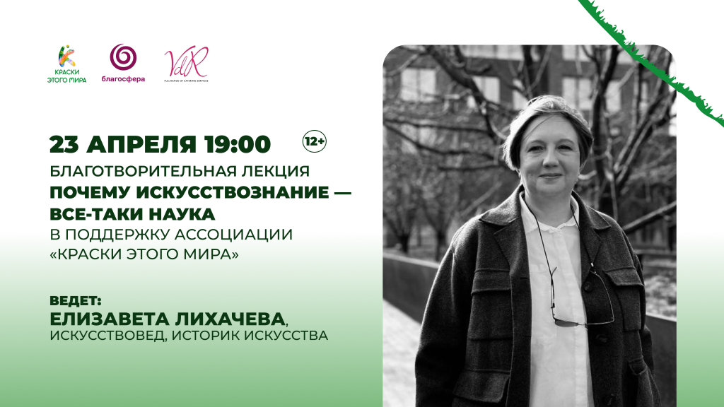 23 апреля в пространстве «Благосфера» пройдет авторская лекция искусствоведа Елизаветы Лихачевой «Почему искусствознание — всё-таки наука?» в поддержку Ассоциации «Краски этого мира»