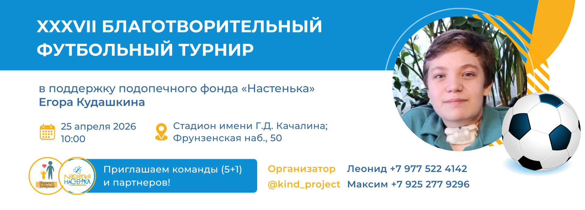 Друзья, 25 апреля приглашаем вас на турнир, где каждый удар по мячу приближает чудо. Мы выходим на поле, чтобы помочь 13-летнему Егору Кудашкину, подопечному фонда «Настенька» подняться на ноги — в прямом смысле этого слова.
